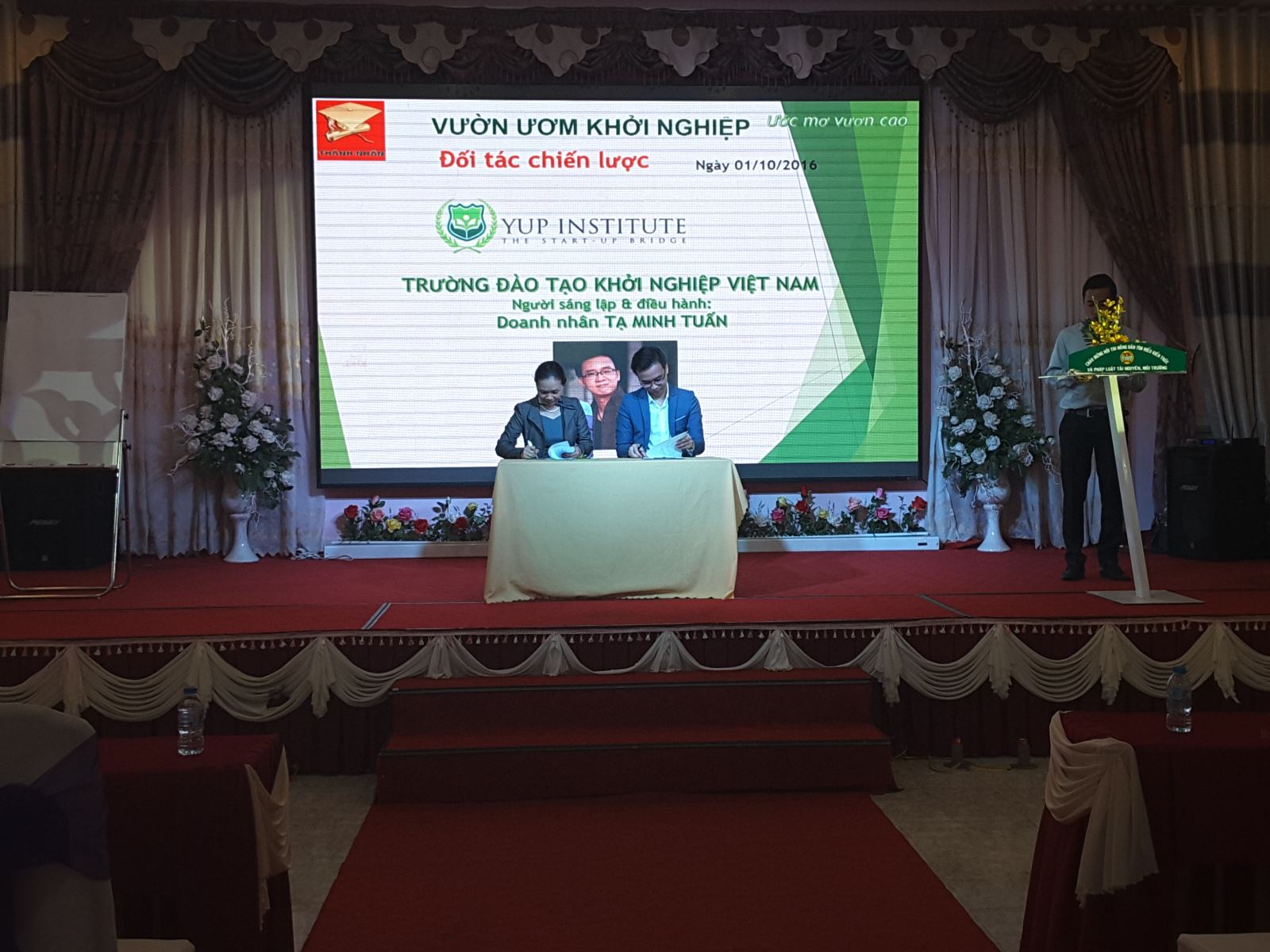 Tại chương trình Bà Nguyễn Thị Yến - Giám đốc Trung tâm ƯDKH&CN hướng nghiệp Thành Nhân và ông Tạ Minh Tuấn - Chủ tịch, người sáng lập Công ty cổ phần YUP đã cùng nhau ký kết hợp đồng hợp tác chương trình đào tạo khởi nghiệp - kinh doanh cho các hạt giống tại vườn ươm khởi nghiệp.